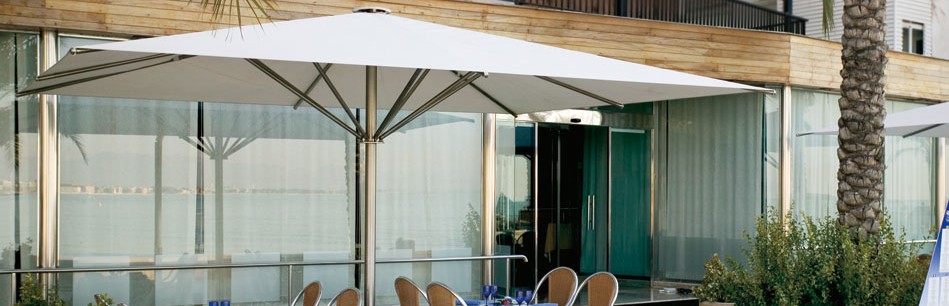 Su accionamiento es tan sencillo como diverso: a motor, mediante una manivela situada en el mástil o con un sistema de bloqueo para los parasoles más sencillos y económico.